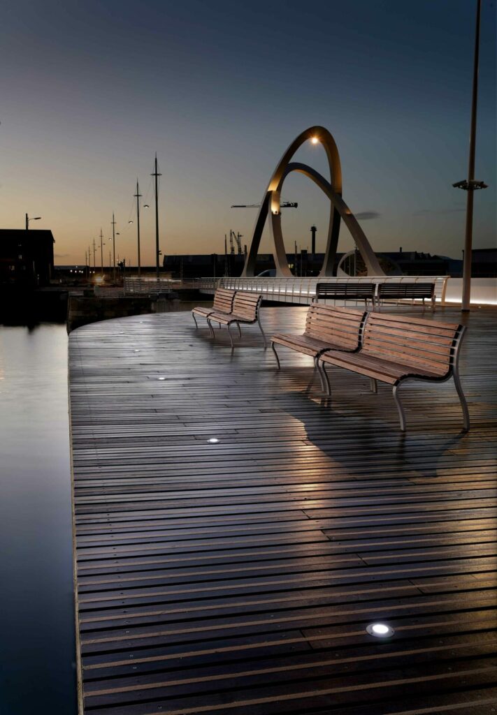 To enhance the surroundings of the Pont des Docks and the quays of the city of Le Havre, the designers conceived a lighting scheme that is both discreet and original.