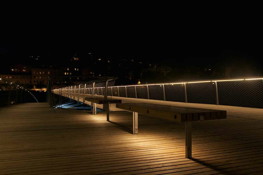 Firmada por Dietmar Feichtinger Architectes y Schlaich Bergermann Partner, la Pasarela de la Paz conecta Caluire con la Cité internationale con gran ligereza.