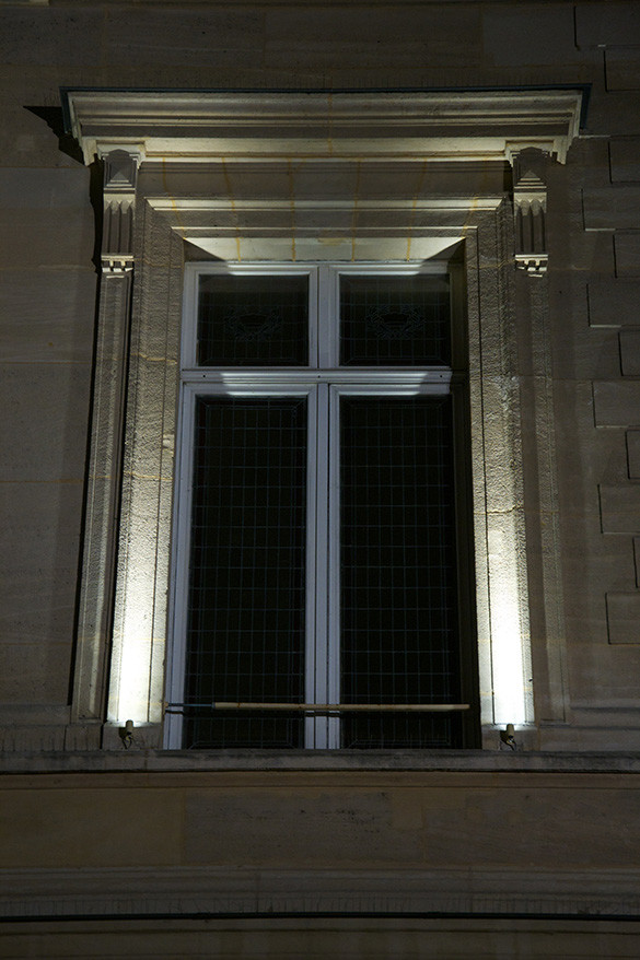 Seulement 330 Watts sont consommés par les 70 projecteurs de LEC sur la façade la mairie du 3è arrondissemment de Paris.