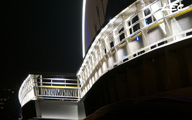 Pour la pose sur bandeau architectural, le choix d’optiques disponibles permet d’avoir des faisceaux pincés montant haut ou une homogéniété de nappage de façade malgré une implantation très rasante.