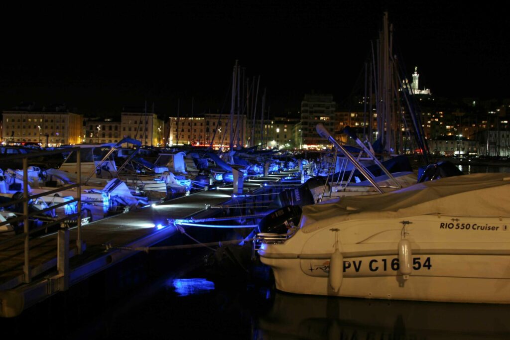 Pour sublimer les pontons du Vieux-Port de Marseille, l’artiste lumière Yann Kersalé a imaginé un éclairage rasant, subtil et bicolore, qui distingue la panne en blanc et les bateaux en bleu, jouant avec les reflets et les mouvements de l’eau.