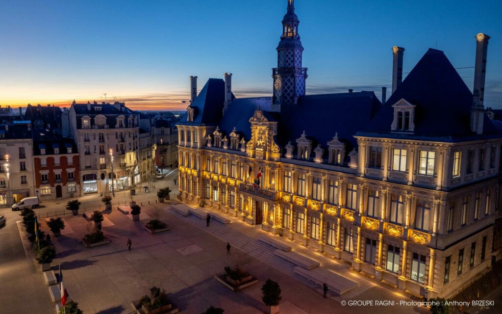 Depuis 2019, l’Hôtel de Ville de Reims bénéficie d’une mise en lumière raffinée, pensée pour révéler l’élégance de son architecture classique une fois la nuit tombée.