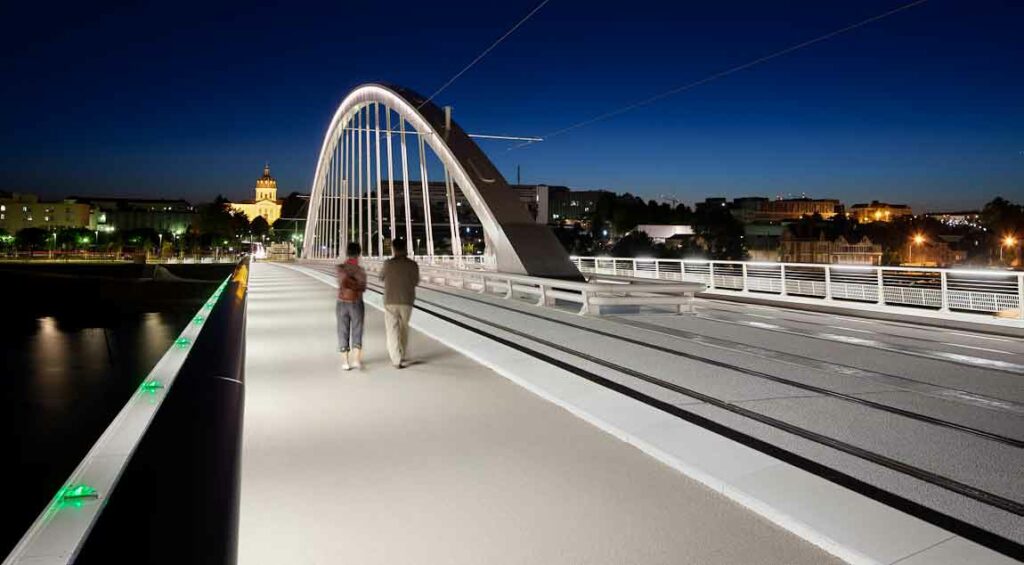 - L’arc de la passerelle est mis en valeur par des lignes en blanc chaud.