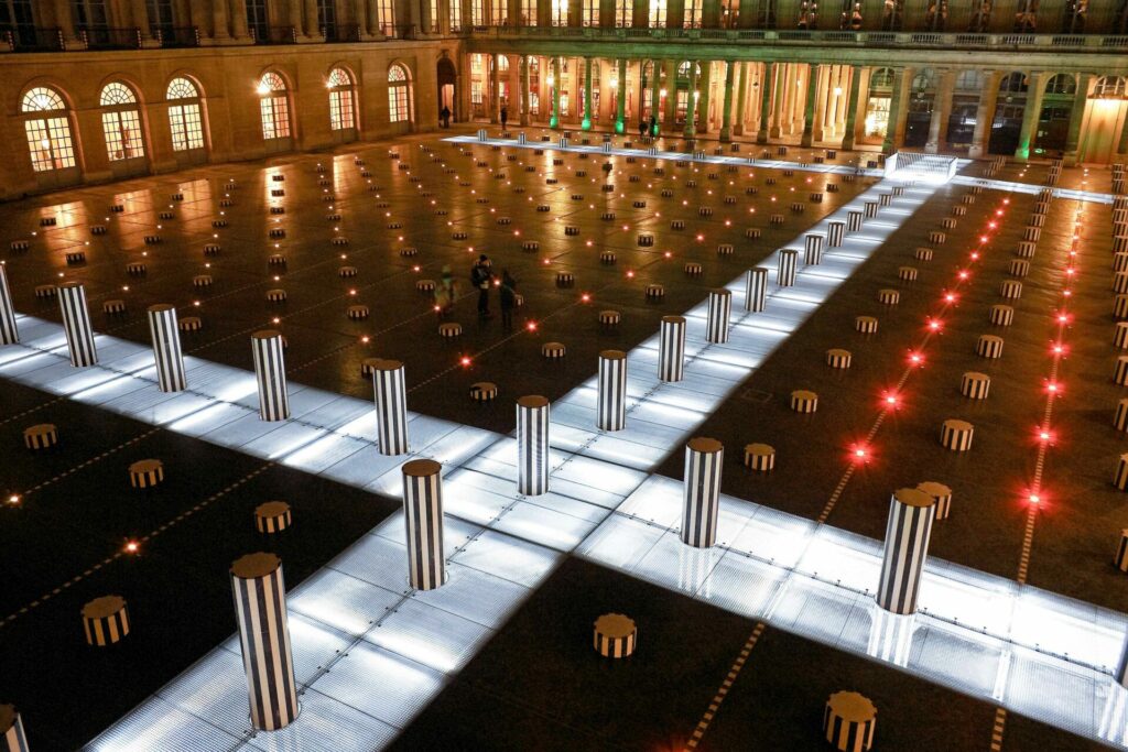 Initialement éclairée en 1985 par des balises PALAIS ROYAL – 1843, sélectionnées par l’architecte Patrick Bouchain, l’installation lumineuse a été repensée pour rester fidèle à l’intention artistique.